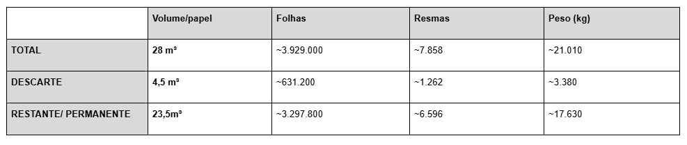 Ao final dos trabalhos, foram descartados 20m³ de documentos, equivalendo a 14 toneladas de papéis armazenados ao longo de aproximadamente 50 anos. Totalizaram-se 2 milhões e 200 mil folhas de papel.