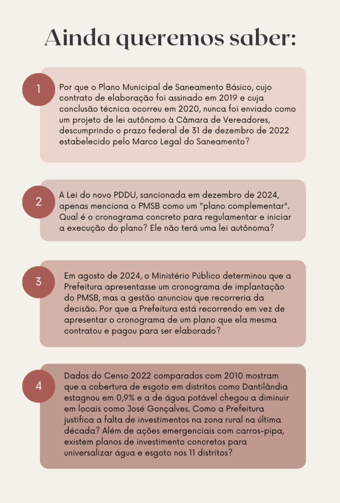 O PDDU foi finalmente aprovado e sancionado em 26 de dezembro de 2024 (Lei Complementar nº 2.959/2024). No entanto, a nova lei apenas cita o PMSB como um “plano complementar”, sem incorporar suas metas ou torná-lo lei. Dez meses após o PDDU entrar em vigor, o plano de saneamento continua no limbo jurídico.