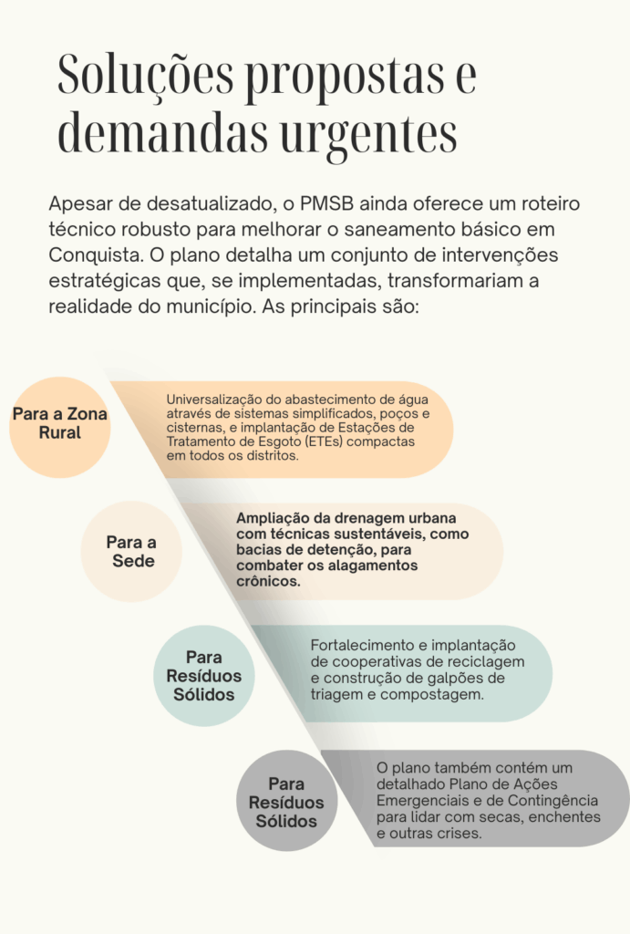 O relato, colhido pelo Conquista Repórter durante a produção da segunda temporada do podcast Fatos & Vozes, é um dos retratos de uma cidade onde a falta de infraestrutura de drenagem, esgoto e abastecimento de água atinge de forma desigual centro, periferia e zona rural. O que poucos sabem é que a solução técnica para esses problemas, o Plano Municipal de Saneamento Básico (PMSB), existe, está detalhada em centenas de páginas, mas continua engavetada pela Prefeitura. Em 2025, o plano não está apenas parado. Ele nasceu desatualizado, baseando seu diagnóstico em dados de uma década e meia atrás.